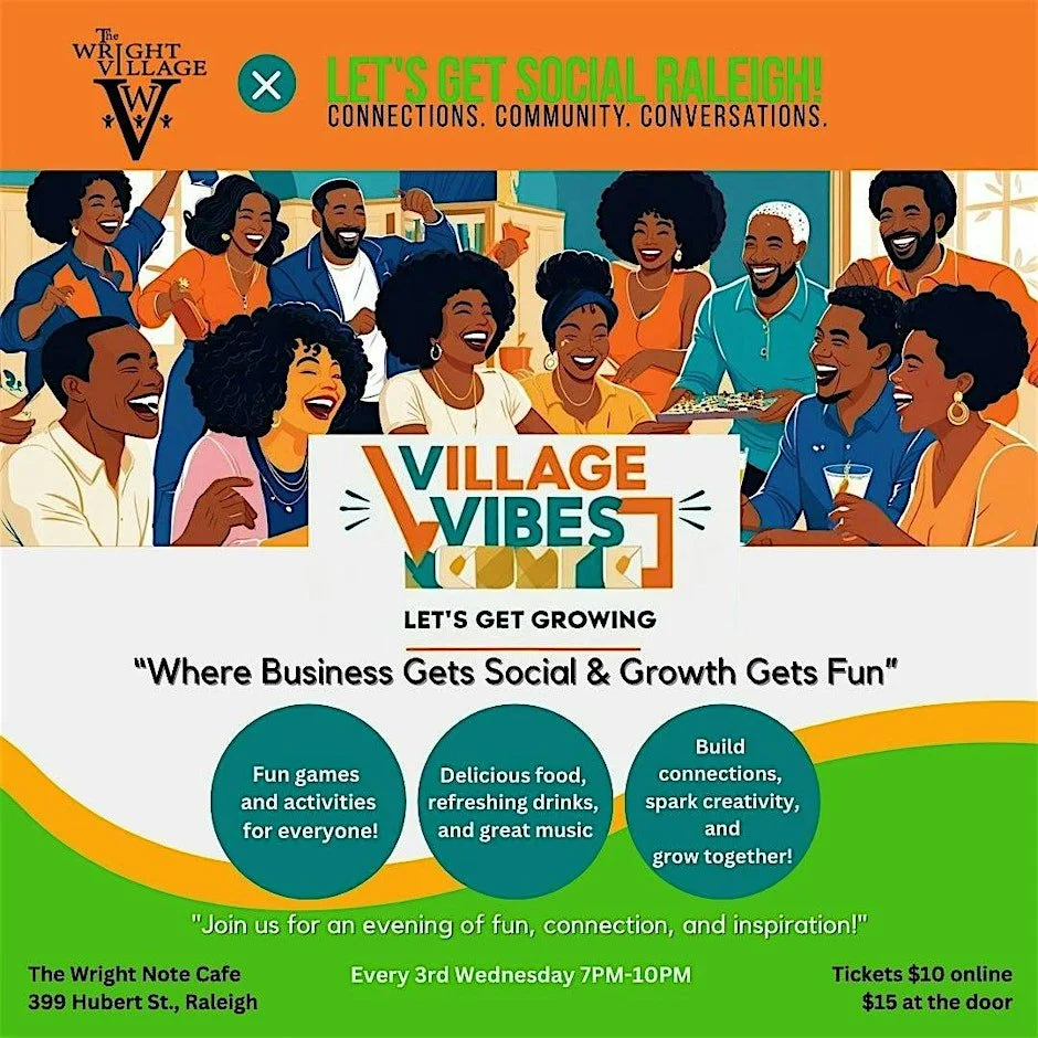 In partnership with Let’s Get Social Raleigh, The Wright Village proudly presents Village Vibes: Let’s Get Growing—a monthly series that blends entrepreneurship with the broader community. This isn’t just another networking event; it’s a dynamic space where relationships are built, ideas take root, and everyone walks away inspired.
